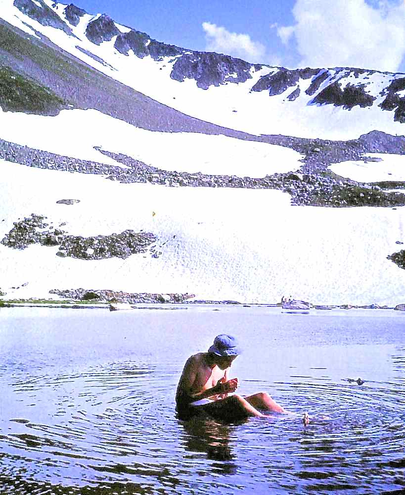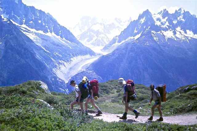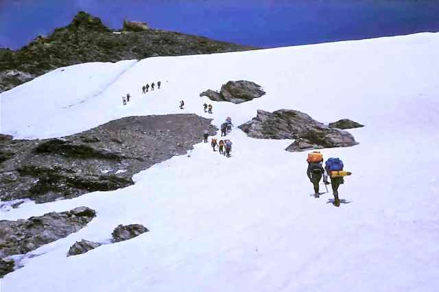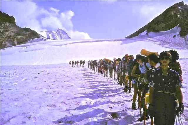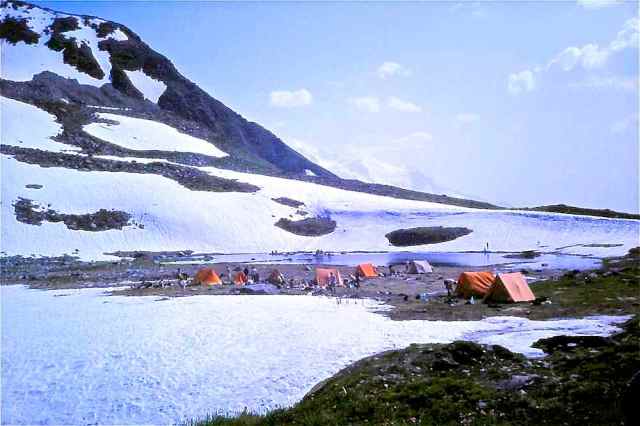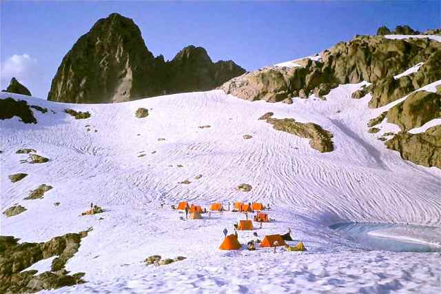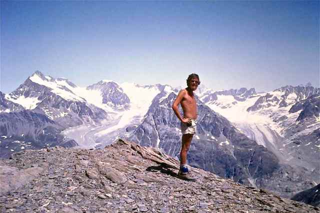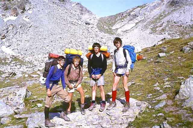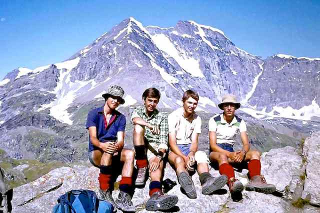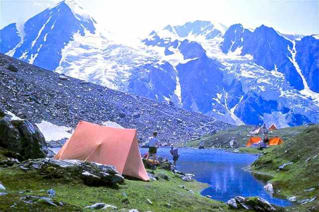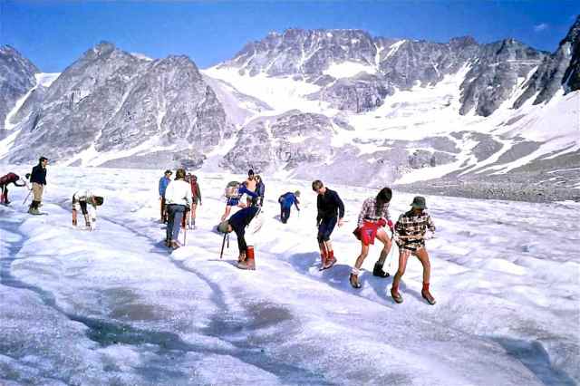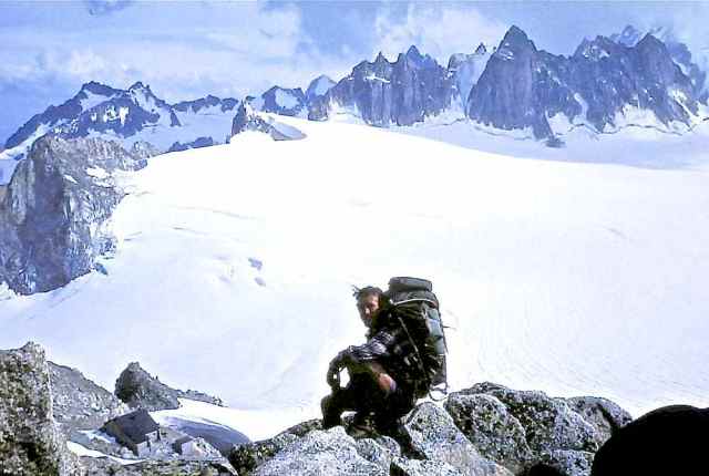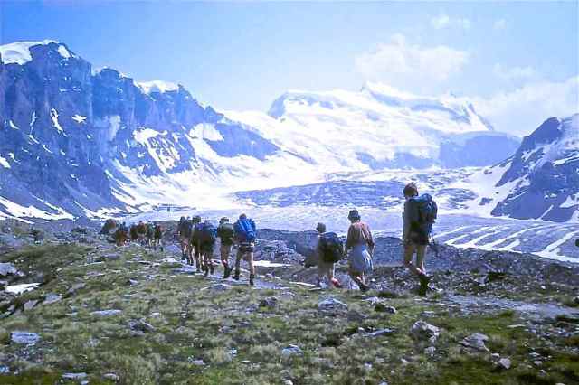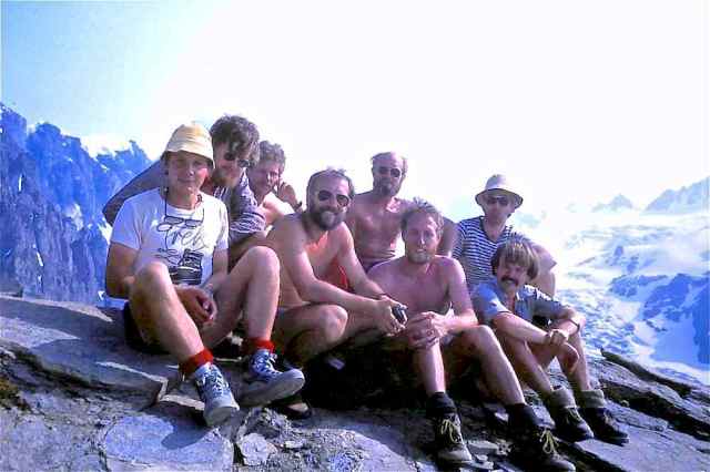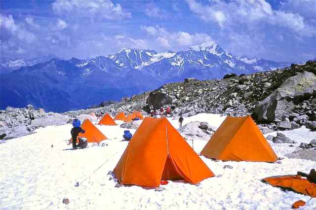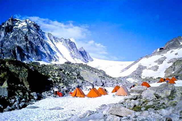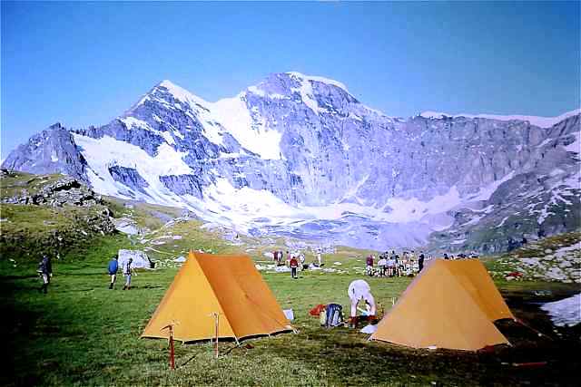 The Route was a variation of the Chamonix to Zermatt theme for walkers, going only as far as Arolla. The first half of the route was a 6-day section from Le Brévent to Orsières, through the Aiguilles Rouges and the northern part of the Mont Blanc Massif, camping in the mountains all the way. It included an ascent of Aiguille Crochues (2837) from Lac Blanc and culminated in an ascent of Pointe d’Orny, at 3270 m the most northerly 3000 m peak in the Mont Blanc Massif. The second half started in the head of Val de Bagnes before the long glacier crossing via the Cabane des Dix to Arolla in Val d’Hérens. There was a 2-day circuit to the Cabane de Pannossière which included an ascent of Grand Tavé (3158). The final 4-day section was via the Chanrion and Dix huts to Arolla, and included a whole-day excursion to Mont Avril (3347) an ascent of Mont Rouge du Giétro (3439) and a crossing of the Giétro and Cheilon glaciers.