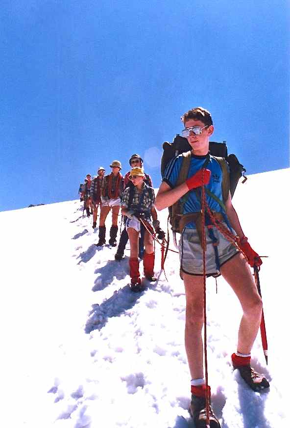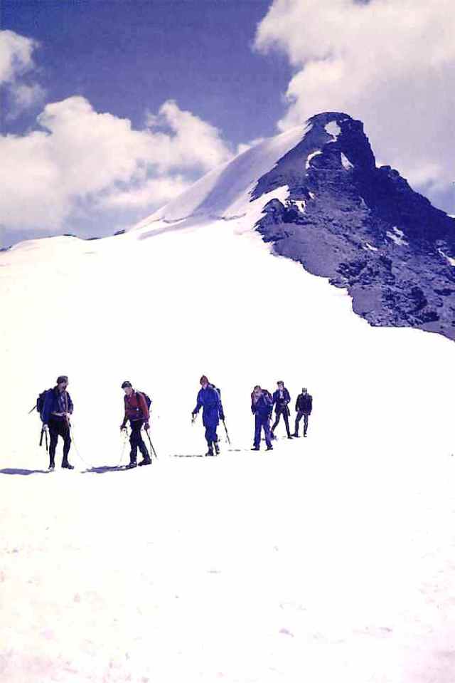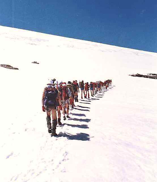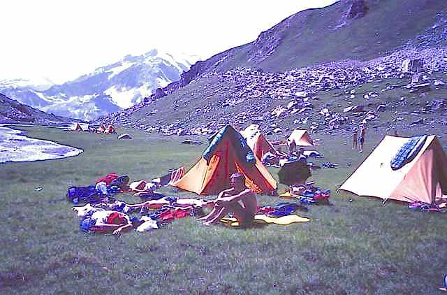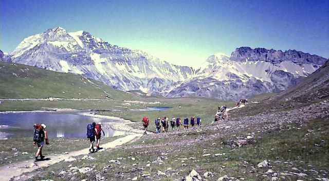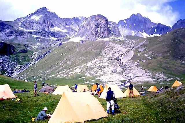 The Route was an almost complete circuit of the Vanoise National Park, passing close to most of the major peaks and through many of the massif’s valleys, and consisted of 4 sections between valley camps. 1. Three-days from Arc 2000 to Pralognan, along the flanks of Mont Pourri, Dôme de Bellecôte and Grand Bec. 2. A whole-day excursion to Pointe de la Réchasse, followed by a three-day loop over Col d’Aussois (with an ascent of the minor peak of Pointe de l’Observatoire, 3015 m) and round the southern end of the Vanoise glacier to Termignon. 3. A spectacular two-day, 35 km crossing through the heart of the National Park, beneath the 1500 m walls of Grande Casse and Grande Motte to Val d’Isère, staying overnight at the Entre Deux Eaux hut. 4. A walk up to camp in the Grande Combe, with an ascent of Aiguille de la Grande Sassière (3747 m) as a finalé.