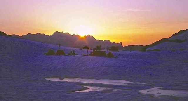 Page image: evening sun on our first night’s camp at Lacs Noirs, with Mont Blanc across the valley