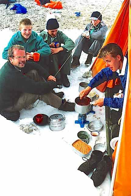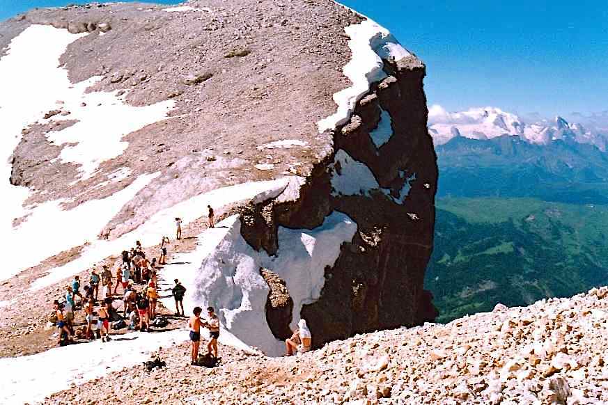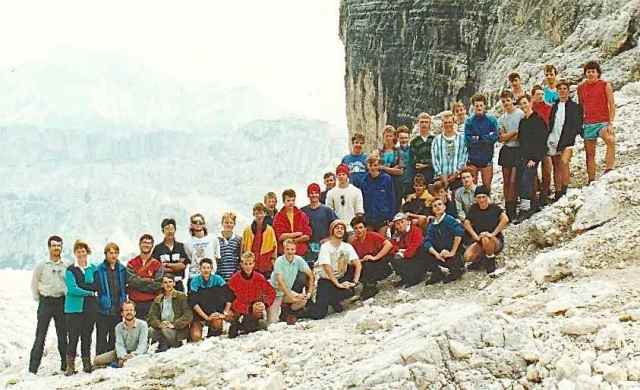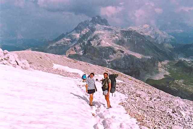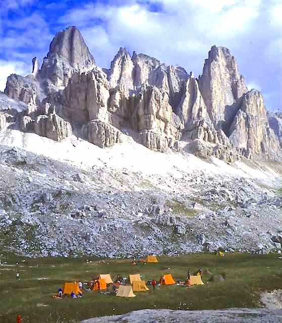 The second part (3 days) was along a short section of the Alta Via 2 from Lago di Fedaia beneath the Marmolada, along the Sas Ciapel ridge and through the Sella Group to Passo Gardena. There were valley camps at Rifugio Saré (above San Cassiano), Cortina, and Malga Ciapela, and we met the coach for supplies at Palafavera and Passo Pordoi. The summits climbed were: Croda del Becco (2810 m), la Varella (3055 m), Lagzuoi Piccolo (2778 m), Nuvolau (2575 m), Monte Coldai (2403 m) and Piz Boè (3152 m).