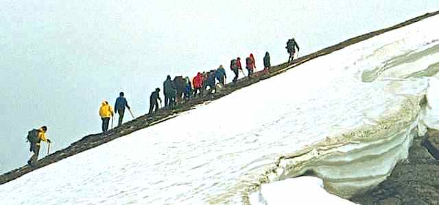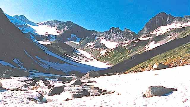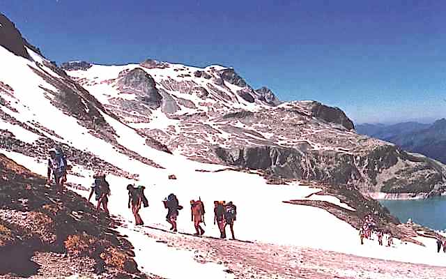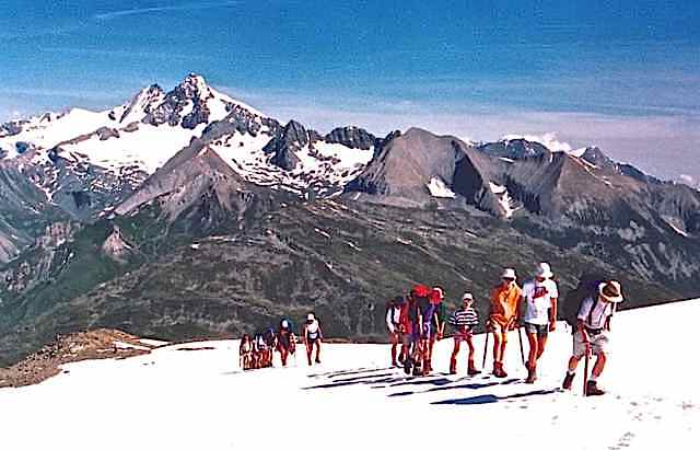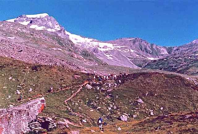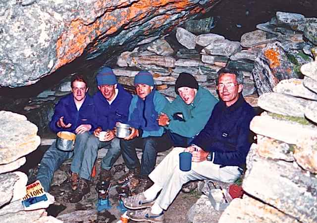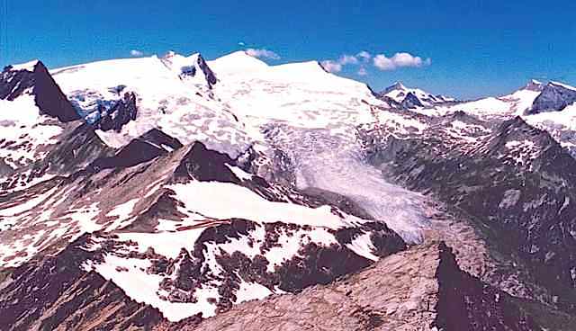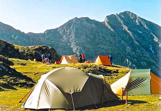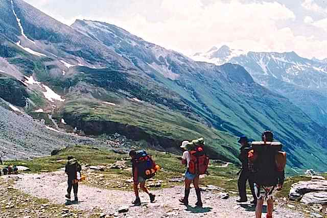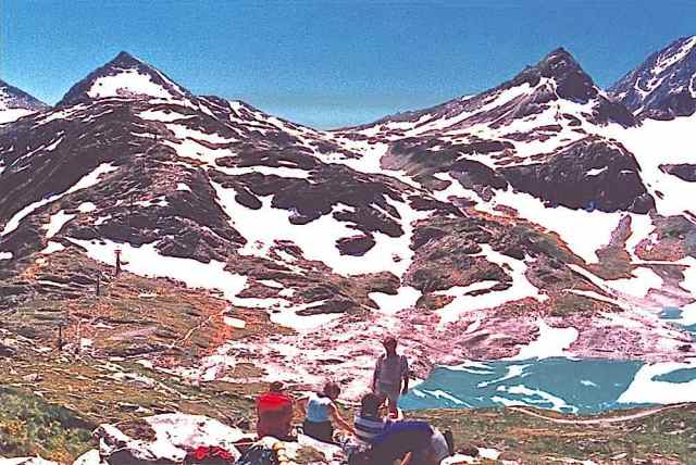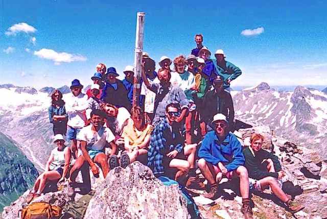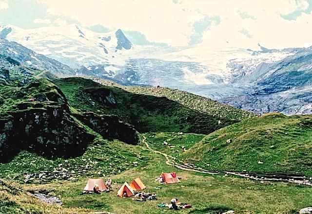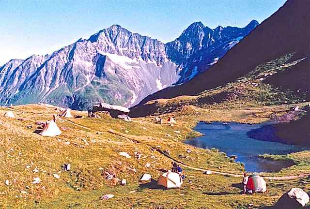 The Route was an almost complete circuit in the Öst Tirol, between two of Austria’s highest mountains, Großglockner and Großvenediger. We were fortunate in having glorious weather virtually all the way and so were able to stay high in the mountains and complete the whole route almost exactly as planned. The route divided into three main sections separated by valley camps in Lienz; a four-day section from the Rudolfshütte, around the western and southern flanks of Großglockner to Kals, with an ascent of Böses Weibl (3121) as a climax; a three-day section crossing the Granatspitze Group, climbing Kleine Muntanitz (3192) on the way; a six-day section (during which the main party didn’t descend below 2100 m) along the eastern flanks of the Venediger Group, with a day excursion to Wilden Kogel (3022).