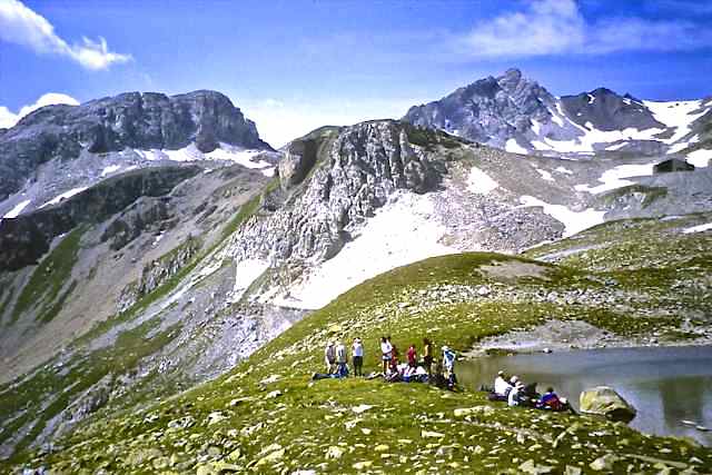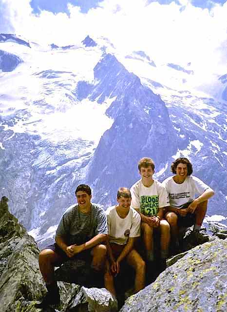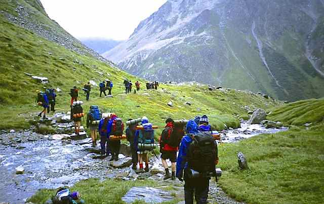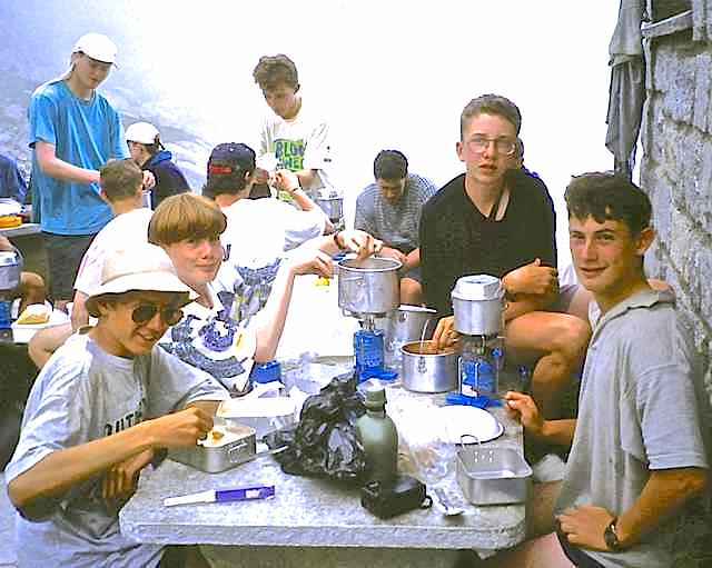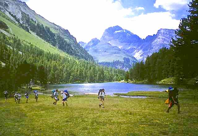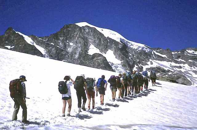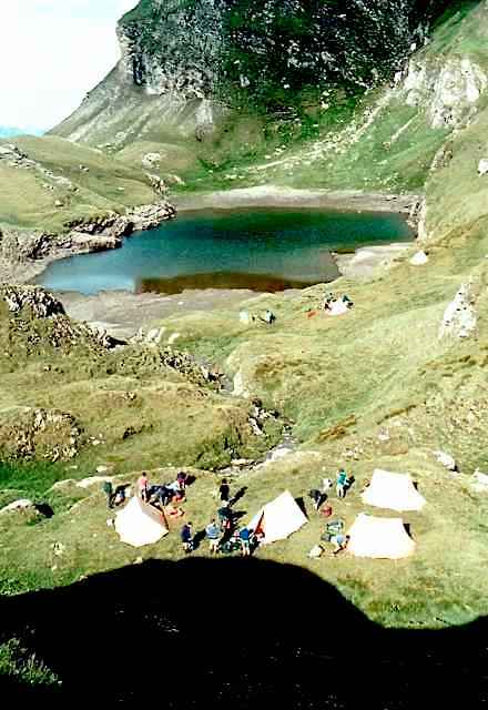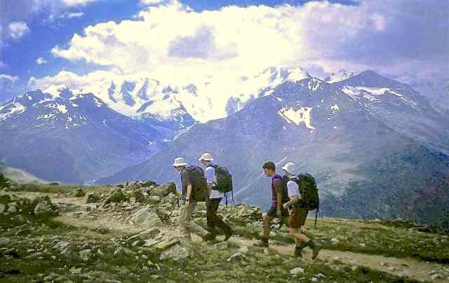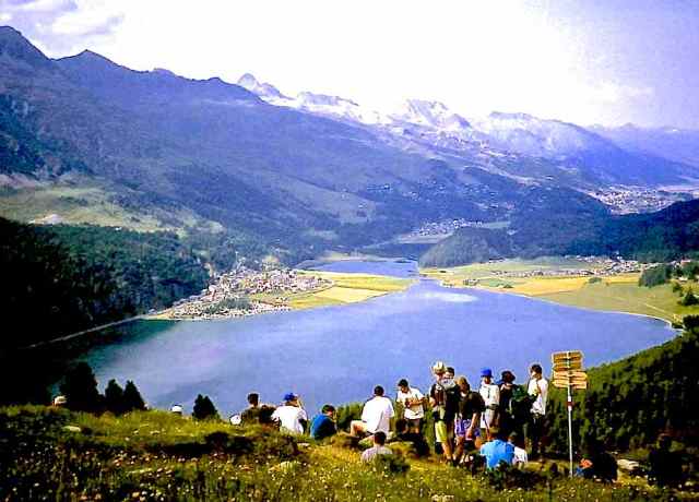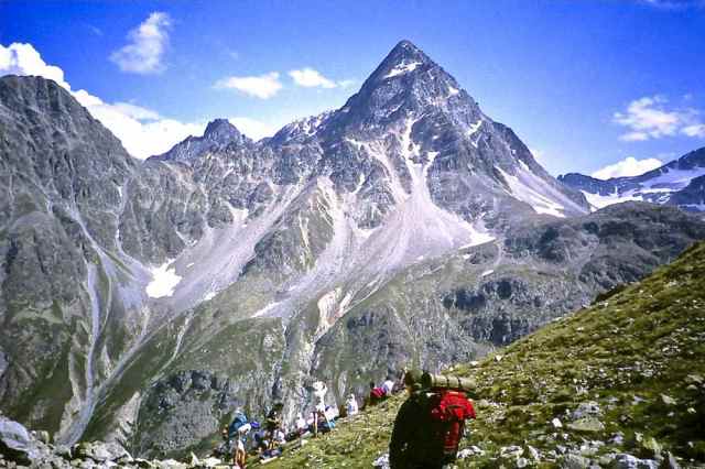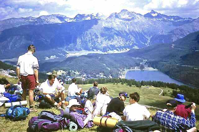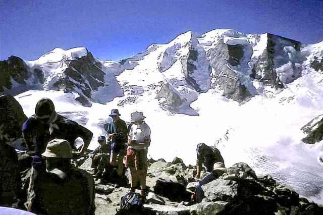 The Route was in two separate parts. The first section consisted of a two-day walk into the Upper Engadine from the Pass d’Alvra, with a mountain camp at Suvretta da Samedan before climbing Piz Nair (3057 m) and descending to St. Moritz, near where we set up camp for six nights at Punt Muragl. From this valley base we made three day excursions to Piz Ot (3246 m), Piz Languard (3262 m), and to Munt Pers (3207 m) and the Morterasch glacier. After a free day we had a further day walk up Val Roseg and over Fuorcla Surlej to Sils Maria.